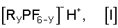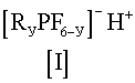 в которой у=1, 2 или 3; лиганды R являются одинаковыми, R представляет собой перфторированную C1-C8-алкильную или арильную группу или R представляет собой частично фторированную C1-C8-алкильную или арильную группу, в которой некоторые атомы F или Н могут быть заменены хлором. 2. Кислота по п.1, отличающаяся тем, что по крайней мере один R представляет собой нонафторбутильную или пентафторфенильную группу, особенно предпочтительно пентафторэтильную группу. 3. Кислота по п.1 или 2, отличающаяся тем, что у=2 или 3, предпочтительно у=3. 4. Кислота по п.1: трифтортрис(пентафторэтил)фосфорная кислота, трифтортрис(гептафтор-н-пропил)фосфорная кислота, трифтортрис(нонафтор-н-бутил)фосфорная кислота, тетрафторбис(нонафтор-н-бутил)фосфорная кислота, пентафтор(нонафтор-н-бутил)фосфорная кислота, тетрафторбис(гептафтор-изопропил)фосфорная кислота. 5. Способ получения кислоты по п.1, отличающийся тем, что перфторалкилфосфоран подвергают реакции с фтороводородом в присутствии подходящего растворителя и/или акцептора протонов. 6. Способ по п.5, отличающийся тем, что применяемый растворитель и/или акцептор протонов представляет собой воду, спирты, простые эфиры, сульфиды, амины, фосфины, карбоновые кислоты, сложные эфиры, гликоли, полигликоли, полиамины, полисульфиды или смеси по крайней мере двух этих растворителей и/или акцепторов протонов. 7. Способ по п.6, отличающийся тем, что подходящий растворитель и/или акцептор протонов представляет собой метанол, этанол, уксусную кислоту, диметиловый эфир, диэтиловый эфир, диметилкарбонат, диметилсульфид, диметилформамид, триэтиламин или трифенилфосфин, или смесь по крайней мере двух этих соединений. 8. Способ по п.5, отличающийся тем, что реакцию перфторалкилфосфорана с раствором фтороводорода выполняют в растворителе при концентрации больше чем 0,1% по весу HF, предпочтительно больше чем 5% по весу HF, более предпочтительно больше чем 10% по весу и наиболее предпочтительно больше чем 20% по весу, но меньше, чем 100% по весу HF. 9. Способ по п.5, отличающийся тем, что реакцию перфторалкилфосфорана выполняют при температуре от -50 до +100°С, предпочтительно при температуре от -35 до +50°С, более предпочтительно при температуре от 0 до 25°С. 10. Раствор кислоты по п.1 и растворителя, отличающийся тем, что кислота присутствует в концентрации больше чем 2% по весу, предпочтительно больше чем 20% по весу, более предпочтительно больше чем 70% по весу и наиболее предпочтительно больше чем 80% по весу. 11. Соль общей формулы [II]