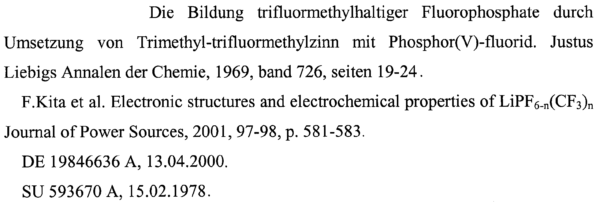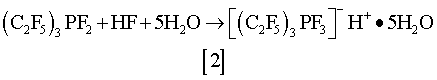 в которой у=1, 2 или 3, и в которой лиганды R могут быть одинаковыми или различными, и R представляет собой перфторированную C1-C8-алкильную или арильную группу или R представляет собой частично фторированную C1-C8-алкильную или арильную группу, в которой некоторые атомы F или Н могут быть заменены хлором. Перфторированные и частично фторированные алкильная или арильная группы R могут быть в форме цепной или кольцевой структуры. Предпочтение отдается кислотам, в которых по крайней мере одна группа R представляет собой перфторированную н-, изо- или трет-бутилъную группу или пентафторфенильную группу и более предпочтительно представляет собой пентафторэтильную группу. Кроме того, предпочтение отдается кислотам, в которых у=2 или 3. Особое предпочтение отдается кислотам, в которых у=3. Особое предпочтение отдается кислотам, согласно изобретению: трифтортрис(пентафторэтил)фосфорная кислота, трифтортрис(нонафтор-н-бутил)фосфорная кислота, трифтортрис(гептафтор-н-пропил)фосфорная кислота, тетрафторбис(нонафтор-н-бутил)фосфорная кислота, пентафтор(нонафтор-н-бутил)фосфорная кислота и тетрафторбис(гептафтор-изопропил)фосфорная кислота. В отношении номенклатуры фторированных фосфорных кислот, можно сослаться на IUPAC номенклатуру (A Guide to IUPAC Nomenclature of Organic Compounds. Recommendations, R. Panico, W.H. Powell и Jean-Claude Richer, Blackwell Science, 1993). Кислоты согласно изобретению имеют преимущество над фторфосфорными кислотами, известными до настоящего времени, которое заключается в том, что они легки в получении, имеют высокую активность протона и стабильны при комнатной температуре в высококонцентрированном растворе. Кроме того, настоящее изобретение относится к способу получения кислот согласно изобретению, в которых перфторалкилфосфоран подвергают реакции с фтороводородом в присутствии подходящего растворителя и/или акцептора протонов. Получение перфторалкилфосфоранов как исходных соединений для способа согласно изобретению является хорошо известным специалисту, квалифицированному в данном уровне техники, из предыдущего уровня техники, например, из Германской Патентной Заявки DE 19846636 A1, которая включена здесь и, таким образом, рассматривается как часть описания. Подходящими растворителями и/или акцепторами протонов для способов согласно изобретению являются предпочтительно соединения, которые имеют один, два или больше следующих атомов: О, N, S, P, Se, Те и As. Предпочтение отдается воде, спирту, простым эфирам, сульфидам, аминам, фосфинам, карбоновым кислотам, сложным эфирам, гликолям, полигликолям, полиаминам, полисульфидам или смесям по крайней мере двух этих растворителей и/или акцепторов протонов. Особенно предпочтительными растворителями и/или акцепторами протонов являются вода, метанол, этанол, уксусная кислота, диметиловый эфир, диэтиловый эфир, диметилкарбонат, диметилсульфид, диметилформамид, триэтиламин или трифенилфосфин, или смеси по крайней мере 2 из этих соединений. Концентрация фтороводорода в подходящем растворителе равна предпочтительно больше чем 0,1% по весу HF, предпочтительно больше чем 5% по весу HF и более предпочтительно больше чем 10% по весу и наиболее предпочтительно больше чем 20% по весу, но меньше чем 100% по весу HF. В предпочтительном воплощении, реакцию перфторалкилфосфорана в способах согласно изобретению выполняют при температуре от -50 