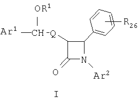 Поэтому предпочтительным соединением формулы I является соединение, в котором R1 является таким, как определено выше, и в котором остальные переменные определены следующим образом: Ar1 означает фенил или R10-замещенный фенил, где R10 означает галоген; Ar2 означает фенил или R11-фенил, где R11 означает от 1 до 3 заместителей, независимо выбранных из группы, включающей (С1-С6)-алкоксил и галоген; Q означает низший алкил (т.е. от С-1 до С-2), причем предпочтительным является Q=С-2, или Q, совместно с циклическим атомом углерода, находящимся в положении 3 азетидинона, образует группу