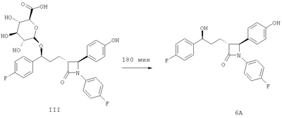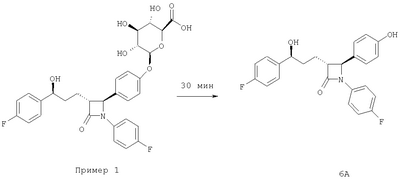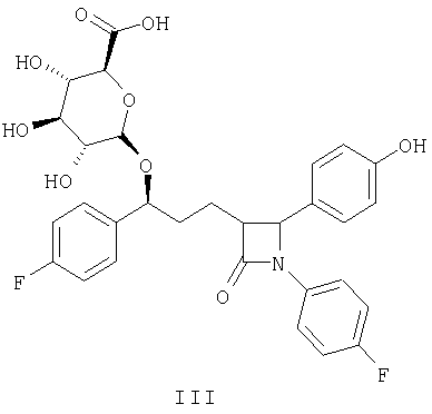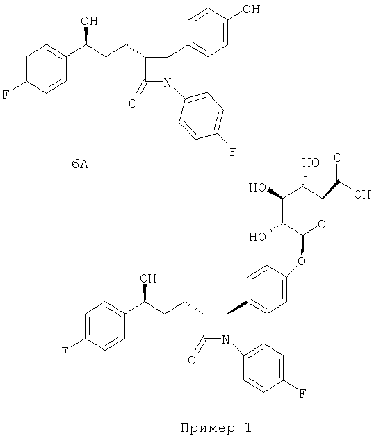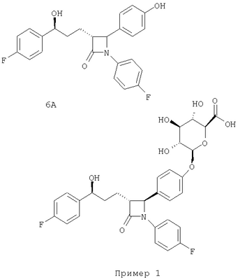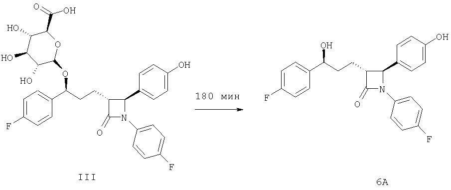 Получение в увеличенном объеме и идентификация структуры соединения III Получение в увеличенном объеме и экстракция соединения III Получение в увеличенном объеме соединения III проводят с использованием 1,23 мг (0,05 мМ) 14C-SCH 58235 и 60 мг белка экспрессированных кДНК рекомбинантных суперсом UGT2B7 человека с прибавлением UDPGA (2 мМ) в 60 мл буферного раствора Tris (трис(гидроксиметиламино)метан), рН 7,4. Инкубирование проводят в течение 2 ч при 37°С и смесь подвергают твердофазной экстракции (ТФЭ). Полученный при ТФЭ метанольный экстракт сушат и соединение III дополнительно очищают так, как это описано ниже. Выделение соединения III для проведения анализа с помощью ЖХ/ЯМР Соединение III выделяют с помощью препаративной ВЭЖХ (высокоэффективная жидкостная хроматография) с отбором фракций. Высушенный остаток полученного при ТФЭ метанольного экстракта размешивают примерно в 3 мл СН3ОН и центрифугируют (16000 g) для удаления твердого осадка. Метанол выпаривают и остаток повторно растворяют примерно в 2 мл смеси СН3ОН: ДМСО (диметилсульфоксид) (20:80, об.: об.). При использовании колонки для препаративной ВЭЖХ (Inertsil C8, 250×20 мм) времена удерживания найдены равными примерно 15,0 и 20,6 мин для соединения Примера 1 и соединения III соответственно. Соединение III выделяют путем инжектирования порций по 200 мкл (всего 10) в препаративную колонку с отбором фракций через 0,5 мин. При каждом инжектировании соединение III элюируется во фракциях от №37 (18,5 мин) до №44 (22,0 мин). Эти фракции, выходящие при времени элюирования, наблюдающемся для соединения III, анализируют с помощью ЖХ-МС/МС. Эти фракции (18,5-22 мин) объединяют и сушат. Определение структуры соединения III с помощью ЖХ/ЯМР ЖХ/ЯМР проводят с использованием подвижной фазы, состоящей из 20 мМ ацетата аммония-d3 (рН 7,0) и ацетонитрила. ВЭЖХ проводят в градиентном режиме с использованием 30% ацетонитрила в течение 10 мин, а затем при повышении концентрации до 40% в течение 20 мин. Метаболит элюируется примерно за 10 мин. ЖХ/ЯМР проводят в режиме остановленной струи в максимуме пика метаболита. Одномерные и двумерные протон-протонные корреляционные спектры снимают на спектрометре ЯМР Varian при 600 МГц и 20°С. Соответствующие данные ЯМР получают для синтетических стандартов соединения 6А и соединения Примера 1 (фенольный глюкуронид соединения 6А). На основании данных ЯМР для образца и сопоставления с данными для стандартов проводят отнесение пиков протонов для этого метаболита (MW 585). Показано, что структура этого метаболита соответствует структуре бензильного глюкуронида соединения 6А (соединение III).