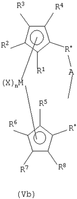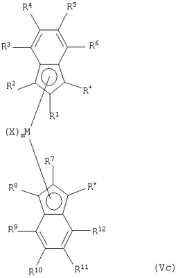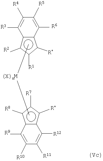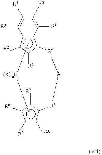 в которой М имеет указанные выше значения, каждый Х химически связан с М, каждая Ср группа химически связана с М, а n обозначает целое число от 0 до 4 и либо 1, либо 2 в отдельном варианте. Лиганды, обозначенные в формуле (I) как СрA и СрB, могут быть одинаковыми или разными циклопентадиенильными лигандами или лигандами, isolobal к циклопентадиенилу, любой из которых или оба могут включать гетероатомы и любой из которых или оба могут быть замещенными группой R. В одном варианте СрA и СрB независимо выбирают из ряда, включающего циклопентадиенил, инденил, тетрагидроинденил, флуоренил и замещенные производные каждого из них. Каждый СрA и СрB формулы (I) может быть независимо незамещенным или замещенным любой одной или сочетанием замещающих групп R. Неограничивающие примеры замещающих групп R, используемых в структуре (I), а также кольцевые заместители в структурах (Va-d) включают группы, выбранные из ряда, включающего водородные радикалы, алкилы, алкенилы, алкинилы, циклоалкилы, арилы, ацилы, ароилы, алкоксигруппы, арилоксигруппы, алкилтиолы, диалкиламины, алкиламидные группы, алкоксикарбонилы, арилоксикарбонилы, карбомоилы, алкил- и диалкилкарбамоилы, ацилоксигруппы, ациламиногруппы, ароиламиногруппы и их сочетания. Более конкретные неограничивающие примеры алкильных заместителей R, ассоциируемых с формулами с (I) по (V), включают метальную, этильную, пропильную, бутильную, пентильную, гексильную, циклопентильную, циклогексильную, бензильную, фенильную, метилфенильную, трет-бутилфенильную группы и т.п., включая все их изомеры, например третичный бутил, изопропил и т.п. Другие возможные радикалы включают замещенные алкилы и арилы, такие как, например, фторметил, фторэтил, дифторэтил, иодпропил, бромгексил, хлорбензил и гидрокарбил, замещенные металлоидорганические радикалы, включающие триметилсилил, триметилгермил, метилдиэтилсилил и т.п.; галокарбилзамещенные металлоидорганические радикалы, включающие трис-(трифторметил)силил, метилбис-(дифторметил)силил, бромметилдиметилгермил и т.п.; дизамещенные борсодержащие радикалы, включающие, например, диметилбор; дизамещенные элементами группы 15 радикалы, включающие диметиламин, диметилфосфин, дифениламин, метилфенилфосфин, и радикалы с элементами группы 16, включающие метокси, этокси, пропокси, фенокси, метилсульфид и этилсульфид. Другие заместители R включают олефины, такие как, хотя ими их список не ограничен, олефиновоненасыщенные заместители, содержащие лиганды с концевым винилом, например 3-бутенил, 2-пропенил, 5-гексенил и т.п. В одном варианте по меньшей мере две группы R, две смежные группы R в одном варианте, связаны с образованием кольцевой структуры, содержащей от 3 до 30 атомов, выбранных из ряда, включающего атомы углерода, азота, кислорода, фосфора, кремния, германия, алюминия, бора и их сочетания. Кроме того, замещающая группа группы R, такая как 1-бутанил, может образовывать с элементом М соединительную ассоциацию. Значение каждого Х в вышеприведенной формуле (I) и для приведенных ниже формул/структур с (II) по (V) независимо выбирают из ряда, включающего любую уходящую группу в одном варианте; галоидные ионы, гидриды, алкилы с C1 по C12, алкенилы с С2 по C12, арилы с С6 по C12, алкиларилы с C7 по С20, алкоксигруппы с C1 по C12, арилоксигруппы с С6 по C16, алкиларилоксигруппы с С7 по C18, фторалкилы с C1 по C12, фторари