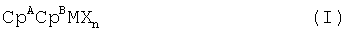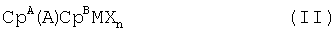 Эти связанные мостиком соединения, представленные формулой (II), известны как “связанные мостиком металлоцены”. СрA, СрB, М, Х и n в структуре (II) имеют значения, указанные выше для формулы (I); каждый Ср лиганд химически связан с М, а группа (А) химически связана с каждым Ср. Неограничивающие примеры мостиковой группы (А) включают двухвалентные углеводородные группы, содержащие по меньшей мере один атом элемента групп с 13 по 16, такой как, хотя ими их список не ограничен, по меньшей мере один из атомов углерода, кислорода, азота, кремния, алюминия, бора, германия, олова и их сочетаний; гетероатом может быть также замещенным алкилом с C1 по C12 или арилом до удовлетворения нейтральной валентности. Мостиковая группа (А) может также включать замещающие группы R, которые указаны выше (для формулы (I)), включая галорадикалы и железо. Более конкретные неограничивающие примеры мостиковой группы (А) представлены алкиленами с C1 по С6, замещенными алкиленами с C1 по С6, атомами кислорода и серы, R’2C=, R’2Si=, -Si(R’)2Si(R’2)-, R’2Ge=, R’P= (где символом “=” обозначены две химические связи), где значения R’ независимо выбирают из группы, включающей гидрид, гидрокарбил, замещенный гидрокарбил, галокарбил, замещенный галокарбил, гидрокарбилзамещенный металлоидорганический, галокарбилзамещенный металлоидорганический радикал, дизамещенный бор, дизамещенные атомы элементов группы 15, замещенные атомы элементов группы 16 и галоидный радикал; и два или большее число групп R’ могут быть связанными с образованием кольца или кольцевой системы. В одном варианте связанный мостиком металлоценовый каталитический компонент формулы (II) обладает двумя или большим числом мостиковых групп (А). Другие неограничивающие примеры мостиковой группы (А) включают метилен, этилен, этилиден, пропилиден, изопропилиден, дифенилметилен, 1,2-диметилэтилен, 1,2-дифенилэтилен, 1,1,2,2-тетраметилэтилен, диметилсилил, диэтилсилил, метилэтилсилил, трифторметилбутилсилил, бис-(трифторметил)силил, ди(н-бутил)силил, ди(н-пропил)силил, ди(изопропил)силил, ди(н-гексил)силил, дициклогексилсилил, дифенилсилил, циклогексилфенилсилил, трет-бутилциклогексилсилил, ди(трет-бутилфенил)силил, ди(п-толил)силил и соответствующие остатки, у которых атом Si замещен атомом Ge или С; диметилсилил, диэтилсилил, диметилгермил и диэтилгермил. В другом варианте мостиковая группа (А) может быть также циклической, включающей, например, от 4 до 10 кольцевых членов, или от 5 до 7 в более особом варианте. Эти кольцевые члены могут быть выбраны из упомянутых выше элементов, из одного или нескольких элементов В, С, Si, Ge, N и О в отдельном варианте. Неограничивающими примерами кольцевых структур, которые могут содержаться в качестве целого или части мостикового остатка, являются циклобутилиден, циклопентилиден, циклогексилиден, циклогептилиден, циклооктилиден и соответствующие кольца, у которых один или два углеродных атома замещены по меньшей мере одним из атомов Si, Ge, N и О, в частности Si и Ge. Расположение связей между кольцом и Ср группами может соответствовать либо цис- или транс-, либо сочетанию конфигураций. Циклические мостиковые группы (А) могут быть насыщенными или ненасыщенными и/или нести один или несколько заместителей, и/или быть сконденсированными с одной или несколькими другими кольцевыми структурами. В случае наличия один или