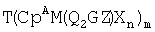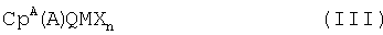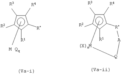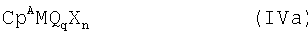 в которой СрA имеет вышеуказанное значение и связан с М; а (А) представляет собой мостиковую группу, связанную с Q и СрA; и в которой атом группы Q связан с М; а n обозначает целое число 0, 1 или 2. В вышеприведенной формуле (III) СрA, (А) и Q могут образовывать конденсированную кольцевую систему. Группы Х и n формулы (III) имеют значения, указанные выше в описании формул (I) и (II). В одном варианте СрA имеет значения, выбранные из ряда, включающего циклопентадиенил, инденил, тетрагидроинденил, флуоренил, их замещенные варианты и их сочетания. В формуле (III) Q обозначает гетероатомсодержащий лиганд, соединительный атом которого (тот атом, который связан с атомом металла М) выбирают из ряда, включающего атомы элементов группы 15 и атомы элементов группы 16 в одном варианте, и выбирают из ряда, включающего атомы азота, фосфора, кислорода и серы в более особом варианте и, тем не менее, в еще более особом варианте атомы азота и кислорода. Неограничивающие примеры групп Q включают следующие радикалы и соединения: алкиламины, ариламины, меркаптосоединения, этоксисоединения, карбоксилаты (в частности, пивалат), карбаматы, азенил, азулен, пентален, фосфоил, фосфинимин, пирролил, пирозолил, карбазолил, борабензол и другие соединения, включающие атомы элементов группы 15 и группы 16, способные соединяться с М. Тем не менее по другому объекту изобретения по меньшей мере один металлоценовый каталитический компонент представляет собой не связанный мостиком “полусандвичевый” металлоцен, представленный формулой (IVa):