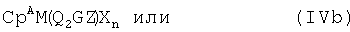 в которой СрA имеет такие же значения, как указанные для Ср групп в описании (I), и представляет собой лиганд, который связан с М; каждый Q независимо связан с М; Х обозначает уходящую группу, как она представлена выше в описании (I); значение n находится в интервале от 0 до 3 и в одном варианте составляет 0 или 3; значение q находится в интервале от 0 до 3 и в одном варианте составляет 0 или 3. В одном варианте СрA имеет значения, выбранные из ряда, включающего циклопентадиенил, инденил, тетрагидроинденил, флуоренил, их замещенные варианты и их сочетания. В формуле (IVa) значения Q выбирают из группы, включающей ROO–, RO-, R(O)-, -NR-, -CR2-, -S-, -NR2, -CR2, -SR, -SiR3, -PR3, -Н и замещенные и незамещенные арильные группы, где значения R выбирают из группы, включающей алкилы с C1 по С6, арилы с С6 по С12, алкиламины с C1 по С6, алкилариламины с С6 по С12, алкоксигруппы с C1 по С6, арилоксигруппы с С6 по C12 и т.п. Неограничивающие примеры значений Q включают карбаматы с C1 по C12, карбоксилаты с C1 по C12 (в частности, пивалат), аллилы с С2 по С20 и гетероаллильные остатки с С2 по С20. Если представить по-другому, то “полусандвичевые” упомянутые выше металлоцены могут быть проиллюстрированы с помощью формулы (IVb), в частности так, как изложено, например, в US 6069213: