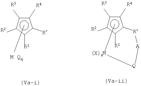 в которой М, СрA, Х и n имеют указанные выше значения; Q2GZ образует полидентатное лигандное элементарное звено (в частности, пивалатное), где по меньшей мере одна из групп Q образует связь с М и характеризуется таким образом, что значения каждой группы Q независимо выбирают из ряда, включающего -O-, -NR-, -CR2– и -S-; G обозначает атом либо углерода, либо кремния; значения Z выбирают из ряда, включающего R, -OR, -NR2, -CR3, -SR, -SiR3, -PR2 и гидрид, при условии, что когда Q обозначает -NR-, тогда значения Z выбирают из ряда, включающего -OR, -NR2, -SR, -SiR3, -PR2, и при условии, что нейтральная валентность Q удовлетворяется посредством Z; и где значения каждого R независимо выбирают из ряда, включающего гетероатомсодержащие группы с C1 по С10 алкилы с C1 по С10, арилы с С6 по С12, алкиларилы с С6 по C12, алкоксигруппы с C1 по С10 и арилоксигруппы с С6 по С12; n обозначает 1 или 2 в отдельном варианте; а Т обозначает мостиковую группу, выбранную из ряда, включающего алкилены с C1 по С10, арилены с С6 по C12, гетероатомсодержащие группы с C1 по С10 и гетероциклические группы с С6 по C12; где каждая группа Т связывает мостиками смежные группы “СрAM(Q2GZ)Xn” и химически связана с группами СрA; m обозначает целое число от 1 до 7; в более особом варианте m обозначает целое число от 2 до 6. По другому выполнения изобретения по меньшей мере один металлоценовый каталитический компонент может быть более конкретно представлен в виде структур (Va), (Vb), (Vc) и (Vd): где в структурах с (Va) по (Vd) значения М выбирают из ряда, включающего атомы элементов с группы 3 по группу 12, и выбирают из ряда, включающего атомы элементов с группы 3 по группу 10 в более особом варианте, тем не менее в еще более особом варианте выбирают из ряда, включающего атомы элементов с группы 3 по группу 6, однако в еще более особом варианте выбирают из ряда, включающего атомы элементов группы 4, тем не менее выбирают из ряда, включающего Zr и Hf, однако в еще более особом варианте он обозначает Zr; в которой значения Q в (Va-i) и (Va-ii) выбирают из ряда, включающего галоидные ионы, алкилы, алкилены, арилы, арилены, алкоксигруппы, арилоксигруппы, амины, алкиламины, фосфины, алкилфосфины, замещенные алкилы, замещенные арилы, замещенные алкоксигруппы, замещенные арилоксигруппы, замещенные амины, замещенные алкиламины, замещенные фосфины, замещенные алкилфосфины, карбаматы, гетероаллилы, карбоксилаты (неограничивающие примеры подходящих карбаматов и карбоксилатов включают триметилацетат, триметилацетат, метилацетат, п-толуат, бензоат, диэтилкарбамат и диметилкарбамат), фторированные алкилы, фторированные арилы и фторированные алкилкарбоксилаты; q обозначает целое число в интервале от 1 до 3; в которой значения каждого R* независимо выбирают из группы, включающей гидрокарбилы и гетероатомсодержащие гидрокарбилы в одном варианте; и выбирают из группы, включающей алкилены, замещенные алкилены и гетероатомсодержащие гидрокарбилы в другом варианте; выбирают из группы, включающей алкилены с С1 по С12, замещенные алкилены с C1 по С12 и гетероатомсодержащие углеводороды с С1 по С12 в более особом варианте; и, тем не менее, выбирают из группы, включающей алкилены с C1 по С4 в более особом варианте; и в которой обе группы R* в структурах (Vb-d) являются одинаковыми в другом варианте; А имеет значения, указанные выше для (А) в структуре (II), а более конкретно выбирают из группы, включающей -O-, -S-, -SO2-, -NR-, =Si