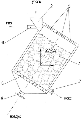 Устройство работает следующим образом. В шахту 1 предлагаемого устройства через загрузочный люк 2 загружают дробленый уголь, под газораспределительную решетку 3 внизу шахты через патрубок 4 подают воздушное дутье и поджигают слой угля электротермическим устройством 5 со стороны, противоположной подаче дутья, с целью образования обратной тепловой волны, которая с постоянной скоростью смещается навстречу потоку воздуха, оставляя за собой слой горячего кокса. Уголь при прохождении тепловой волны последовательно подвергается нагреву, сушке и пиролизу. Горючие продукты пиролиза полностью сгорают в кислороде воздуха с образованием диоксида углерода и водяного пара, которые затем восстанавливаются на горячей поверхности кокса до оксида углерода и водорода, образуя, таким образом, горючий газ, не содержащий углеводородов ряда выше метана, в том числе конденсируемых смолистых веществ. Газ отводится через патрубок 6. После достижения тепловой волной уровня газораспределительной решетки 3 процесс завершается. По завершении процесса коксования производится охлаждение (сухое тушение) кокса газом посредством его принудительной циркуляции по контуру “аппарат – теплообменник” последовательно через патрубок 6, слой кокса, патрубок 5 с полезным отбором тепловой энергии. Охлажденный кокс выгружается через люк 7.