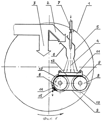 Способ подготовки шихты к спеканию реализуется с помощью устройства, показанного на фиг.1 и 2. На фиг.1 показан фронтальный вид устройства, на фиг.2 показан боковой вид устройства со стороны разгрузки напыленного слоя.