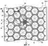 Правда, здесь направляющая линия 30-1 и все внутренние, параллельные ей линии 30-2, 30-3 и т.д., расположенные аналогично оси 16 на фиг.2 параллельно наружному краю, представляют собой концентрические окружности. Соответственно другие оси 31 и 32, сдвинутые относительно направляющей линии 30-1 на 60° влево и вправо, искривлены относительно центра окружностей, так что стороны образованных из них треугольников становятся короче по мере приближения к центру, который расположен в удаленной точке М пересечения двух изображенных радиусов R. Это означает, что сторона FK треугольника FKL, расположенного ближе к центру, короче стороны EF треугольника EFG, расположенного дальше от центра. Это же относится и к другим соответственным сторонам. Кроме того, и диаметры выступов 6 по мере приближения к центру М окружностей уменьшаются, так как внутренняя направляющая линия 30-2 короче внешней направляющей линии 30-1, так что для такого же количества выступов остается меньше места. Этим же объясняется вышеописанное укорочение сторон треугольников и искривление осей 31 и 32.