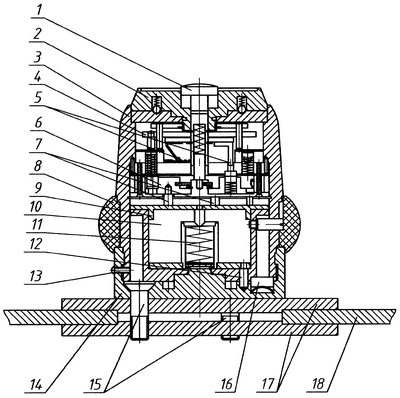 Открытие замка достигается путем поочередной фиксированной установки каждого символа комбинации кода ручкой установки 2 и его последующим вводом нажатием кнопки 1. При этом механизмом последовательного ввода 4 при правильном наборе комбинации обеспечивается поворот кодового диска 6 в положение “открыто”. При этом толкатели 7, жестко закрепленные на диске, передвигаясь по поверхности крышки привода 9, входят в ее проточки, пружина 11 перемещает стопоры 12, выводит их из зацепления с основанием 14, разблокируя привод запорного устройства 10. При переведении ручкой 8 привода запорного устройства 10 в положение “открыто” корпус привода запорного устройства, имеющий паз под стопор корпуса 16, прижимает стопор корпуса 16 к основанию 14, выводя его из зацепления с корпусом 3 байонетного соединения, делая возможным разборку корпуса при снятии стопорного винта 13.