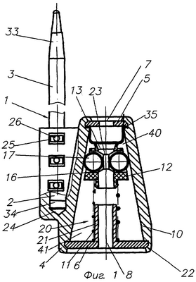 Выполнение же втулки 21 – стабилизатора за одно целое с задней крышкой 6 не только гарантирует его соосное размещение относительно осевого отверстия 13 в сепараторе 12, а потому и легкую заправку отрезка троса, но и исключает возможность вскрытия крышки при злоумышленном воздействии через зазоры в выходном отверстии 7 и отрезком троса. Последний для удобства заправки снабжен наконечником 33 (либо опаян с образованием конического конца, а его пассивный конец 2 либо снабжен втулкой 34, либо предварительно опаян.