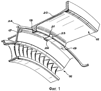 Штифт 23, который показан также на фигуре 2, вставляется в отверстия 21 и 22, препятствуя тем самым проворачиванию сектора 16 по отношению к корпусу 15. Он удерживается на своем месте в отверстиях 21 и 22 при помощи крепежного стопорного кольца 24, помещенного на дно канавки 18 под обод 17, начиная от отверстия (не показано), выполненного в крюкообразной части 19, и которое пропускается сквозь выемку 25 в штифте 23. Случайный выход штифта 23 наружу может быть предотвращен при помощи стопорной лапки 26, выступающей относительно штифта 23, которая контактирует с одной стороны с корпусом, а с другой стороны – с сектором 16 направляющего аппарата. Это может быть осуществлено путем соединения сектора 16 направляющего аппарата с корпусом, после того как штифт 23 будет вставлен на свое место в отверстиях 21 и 22. Корпус 15 соединен с другим корпусом 27, в радиальном направлении внутренним по отношению к нему, при этом отверстие 21 выходит на нижнюю сторону указанного другого корпуса 27, и стопорная лапка 26 контактирует с корпусом 27, хотя это практически ничего не меняет.