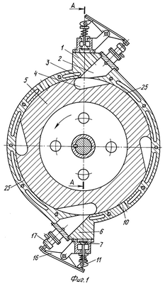Двигатель содержит статор 1, камеру сгорания 2, нижняя часть которой соединяется соплом 3 с полостями 4 ротора 5 во время рабочего такта, а верхняя часть соединена через канал 6 и впускной клапан 7 с системой подачи сжатого воздуха, а через канал 8 и выпускной клапан 9 – с атмосферой, отверстие 10 сброса давления из полостей 4, распределительный вал 11, кинематически связанный с осью ротора 12 через систему шестерен 13, а кулачком 14 с клапаном 7, кулачком 15 с рычагом 16 насоса-форсунки 17, кулачком 18 с клапаном 9, а также с распределителем 19, свечи 20. Ротор 5, являющийся и маховиком, установлен в корпусе 1 с минимальным зазором между наружной поверхностью ротора и внутренней поверхностью статора, обеспечивая свободное вращение ротора, закреплен на оси 12 в корпусе 1 на подшипниках 21 и закрыт крышкой 22. По диаметру краев ротор 5 содержит секционные уплотнители 23 (например, графитовые), а полости 4 по бокам имеют перегородки 24, кроме того, ротор имеет выступы 25, которые перекрывают сопло 3 после рабочего такта.