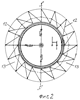 Чтобы направляющие ребра 12 не создавали сопротивление воздуху на выходе из ветродвигателя, ветронаправляющие устройства 10 и 11 разделены каждое на шестнадцать секторов 13, имеющих по одному ребру 12 на каждом. Сектор 13 свободно качается на оси 14, которая перпендикулярна радиусу ветродвигателя и смещена с центра сектора в сторону центра ветродвигателя в пропорции 2:1 длины сектора 13.
