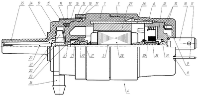 Центробежный насос содержит корпус 1, выполненный в виде стакана, в центре дна которого имеется отверстие. В гнезде 2 установлено уплотнение 3. Вал 5 электродвигателя 4 проходит в отверстие корпуса 1 через уплотнение 3. Крышка 6 закреплена на корпусе 1 с помощью замкового соединения 7. В дне крышки 6 имеются отверстия 8 и 9, через которые проходят клеммы 10 и 11 подключения электродвигателя 4. Насосная камера 12 закреплена на корпусе 1 с помощью замкового соединения 13. Между насосной камерой 12 и корпусом 1 расположено уплотнительное кольцо 14. Уплотнительное кольцо 14 установлено в пазы 15 и 16, выполненные на торце корпуса 1 и внутренней поверхности насосной камеры 12, в сечении имеет вид треугольника. На насосную камеру 12 надета фиксирующая втулка 17, вдоль внутренней поверхности которой проходят ребра 18. Ребра 18 фиксирующей втулки 17 входят в пазы 19, расположенные вдоль наружной поверхности насосной камеры 12. Внутренняя и наружная поверхности соответственно фиксирующей втулки 17 и насосной камеры 12 выполнены коническими. Внутри насосной камеры 12 расположен ротор 20 насоса, включающий рабочее колесо с лопатками 21 и шнек 22. Ступица 23 колеса закреплена на валу электродвигателя 4. Шнек 22 проходит через входное отверстие 24 насосной камеры 12 во всасывающий патрубок 25. Вдоль внутренней поверхности корпуса 1 выполнены два направляющих выступа (на фигуре не показаны). Статор электродвигателя включает полый цилиндр 26 с продольной прорезью, внутри которого закреплены постоянные магниты 27. Цилиндр 26 и постоянные магниты 27 установлены внутри корпуса 1 с помощью направляющих выступов корпуса. На валу 5 электродвигателя 4 установлены шихтованный зубцовый якорь с обмоткой 28, коллектор 29. Втулка 30 с первым подшипником 31 закреплены в гнезде 2 корпуса 1. В полом цилиндре 26 и крышке 6 закреплен суппортный узел 32, на котором установлены щеткодержатели со щетками 33, а в его центре – второй подшипник 34. На внутренней поверхности крышки 6 выполнены центрирующие и опорные выступы 35, а на корпусе 1 – пазы для центрирования крышки на корпусе и установки щеток на геометрическую нейтраль (на фигуре не показаны).