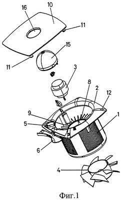 1. Эксгаустер со съемной крышкой, содержащий цилиндрический несущий кожух, который оканчивается со стороны всасывания периметральным фланцем, на котором установлена передняя крышка, причем внутри несущего кожуха установлены электродвигатель, вентилятор и средства регулировки и управления, отличающийся тем, что электродвигатель установлен внутри несущего кожуха в корпусе, выполненном в виде стакана, расположенного в верхней части цилиндрической части кожуха и удерживаемого внутри указанной цилиндрической части с помощью множества дугообразных радиальных выступов в виде лопаток, предотвращающих доступ к подвижным частям, а передняя крышка снабжена крепежными элементами для ее крепления к периметральному фланцу с возможностью отсоединения от него, при этом указанные крепежные элементы состоят из нескольких лапок, отходящих от внутренней поверхности передней крышки и соответствующих отверстиям, выполненным в периметральном фланце несущего кожуха.