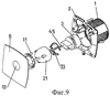 фиг.8 – вид в аксонометрии автоматически открывающегося эксгаустера в разобранном состоянии согласно второму варианту осуществления изобретения, в котором устройство для осевого перемещения содержит электродвигатель,