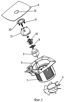 Для облегчения чистки эксгаустера передняя крышка (6) является съемной и может отсоединяться от соединительных опор (11). Для этого на внутренней стороне передней крышки (6) имеется несколько лапок (18), входящих в канавки (19), выполненные в кольце (20), закрепленном на концах соединительных опор (11).