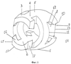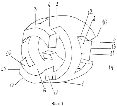 В преимущественном варианте выполнения, например, высота 12 выреза полки 8 паза 7 должна ориентировочно быть не менее чем в 1,5-2 раза больше высоты 15 полки 16 выступа 3 для обеспечения свободы движения одного звена по отношению к другому. Также, исходя из этой цели, а также из возможности размещения выступов 3 в сквозном пазу 7, глубина сквозного паза 7 должна быть несколько большей, чем высота выступа 3, а ширина 11 выреза полки 8 паза 7 – несколько большей, чем ширина 17 полки 16 выступа 3. Но при этом должно быть обеспечено и соединение звеньев друг с другом (без рассыпания). В частном случае этому также будет способствовать выполнение торцов 18 полки 16 выступа 3 трапециевидной формы под углом к кольцевой поверхности цилиндрической части втулки, что обеспечивает при размещении выступов 3 в пазе 7 частичное зацепление выступов 3 посредством торцов 18 в вырезе полки 8.