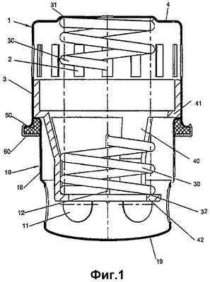 На фиг.1 показан первый вариант осуществления вкладыша согласно изобретению. Вкладыш содержит первый чашеобразный участок 1 с боковой стенкой 3 и концевым основанием 4 и второй чашеобразный участок 10 с боковой стенкой 18 и концевым основанием 19. Второй чашеобразный участок 10 можно перемещать в осевом направлении внутрь в первом чашеобразном участке 1, как будет описано ниже. Между двумя чашеобразными участками 1, 10 размещена частично сжатая прижимная пружина 30, находящаяся на одном конце 31 в упоре с концевым основанием 4 первого чашеобразного участка 1, в то время как другой конец находится в упоре с концевым основанием 42 направляющей 40 пружины. Направляющая 40 пружины содержит первое кольцо 41, которое плотно посажено внутри первого чашеобразного участка 1, и второе кольцо, которое составляет концевое основание 42 направляющей 40 пружины. Между двумя кольцами 41, 42 направляющая 40 пружины перфорирована большими отверстиями, которые обеспечивают прохождение среды без существенных снижений давления.