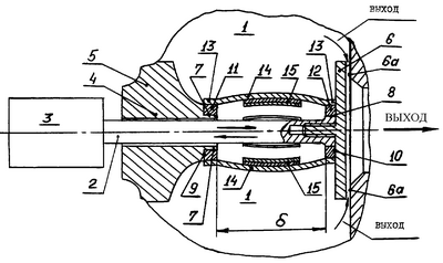 При работе энергетической установки в теплонапряженной камере 1 создается повышенная (до нескольких сотен градусов) температура, воздействующая на продольные термобиметаллические пружины 15, изгибающиеся при нагреве в сторону инертного слоя, а при охлаждении – в сторону активного слоя. Усилие изгибающихся термобиметаллических пружин 15 воздействует на скрепленный с ними упругий кольцеобразный экран 14, который через контактные уплотнительные кольца 11, 12 и через торцевую выточку 7 крышки 5 камеры 1 и проточку 8 вала 2 воздействует на соответствующие посадочные контактные поверхности 9 и 10 крышки 5 и торцевой коронки 6, взаимодействующей с выходным каналом 6а. При этом изгиб пружин 15 происходит в сторону инертного слоя, увеличивая относительный зазор , а следовательно, увеличивается усилие контакта контактных поверхностей 9 и 10 с уплотнительными кольцами 11 и 12 и экранируется полость камеры 1 от втулки 4 под вал 2 в крышке 5 энергоустановки.