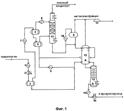 Из отпарной колонны 11 отпаренный газ направляется на дальнейшее обогащение гелием с целью получения гелиевого концентрата в соответствующих гелиевых колоннах (на чертеже не показаны).