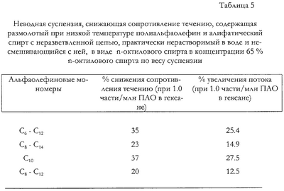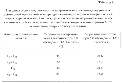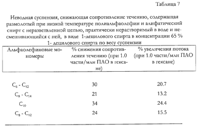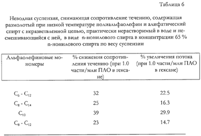 Изобретение относится к химии полимеров, а именно к составам, включающим в себя предварительно размолотый при низкой температуре полиальфаолефин и, по крайней мере, один алифатический спирт с неразветвленной цепью, практически нерастворимый в воде и несмешивающийся с ней, и действующий в качестве неводной суспензии, уменьшающей гидравлическое сопротивление течению. Описан также способ производства таких неводных суспензий, уменьшающих гидравлическое сопротивление течению, включающий контакт альфаолефиновых мономеров с катализатором в реакционной смеси с образованием полиальфаолефина, где в качестве катализатора используется катализатор Циглера-Натта, а именно трихлорид титана. Сокатализатор выбирают из группы, состоящей из алкилалюминооксанов, галогенуглеводородов, хлорида диэтилалюминия и хлорида дибутилалюминия. В результате реализации способа получают ультравысокомолекулярный полиальфаолефин, имеющий характеристическую вязкость, значение которой составляет, по крайней мере, около 10 децилитров на грамм, и являющийся аморфным веществом, практически не содержащим кристаллических частиц. Полученный ультравысокомолекулярный полиальфаолефин размалывают при низкой температуре и соединяют, по крайней мере, с одним алифатическим спиртом с неразветвленной цепью, практически нерастворимым в воде и несмешивающимся с ней с образованием неводной суспензии, уменьшающей гидравлическое сопротивление течению. Описан также способ уменьшения гидравлического сопротивления в канале течения с помощью неводной суспензии. 7 н. и 15 з.п. ф-лы, 7 табл.