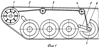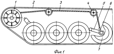 На фиг.1-3 обозначены: 1 – ведущее колесо, 2 – гусеничная лента, 3 – трос для натаскивания гусеницы, 4 и 10 – поддерживающий каток, 5 и 13 – балансир, 6 – крюк, 7 и 12 – опорный каток, 8 – дополнительный кронштейн, 9 и 15 – тяга, 11 и 14 – трос с петлей и цепью, 16 – гайка, 17 – шайба.
