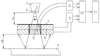 На чертеже приведена структурная блок-схема рентгеновского устройства. Оно содержит источник 1 рентгеновского излучения, коллиматор 2 с окном 3, закрепленный заподлицо к торцу излучателя 1, контролируемую прокатную ленту 4, первую двухсекционную камеру 5, размещенную между излучателем 1 и контролируемой лентой 4 нормально и симметрично прямому рентгеновскому потоку излучения, т.е. окну 3 коллиматора 2, вторую двухсекционную камеру 6, размещенную в отраженном от ленты 4 рентгеновском потоке. Первая камера 5 выполнена в форме сплошного диска, вторая камера 6 – в форме полого диска, например шайбы. Камеры 5, 6 расположены соосно одна в другой и совмещены своими верхними и нижними торцевыми поверхностями в единых плоскостях, при этом вторая камера 6 снабжена рентгенозащитным экраном 7, выполненным на ее внутренней образующей поверхности и на верхней торцевой поверхности, обращенной к излучателю 1, для защиты от попадания в нее прямого потока излучения со стороны первой камеры 5 и от попадания отраженного потока излучения в окружающую среду со стороны излучателя 1. В качестве материала рентгенозащитного экрана 7 лучше всего применять свинец, тантал и др., который наносят на поверхность камеры 6, например, методом напыления или другим. Первая камера 5 обращена к контролируемой ленте 4 секцией, преобразующий элемент которой выполнен из материала с большим значением атомного номера, чем другая секция этой камеры 5, обращенная к излучателю 1. Вторая камера 6 обращена к контролируемой ленте 4 секцией, преобразующий элемент которой выполнен из материала с меньшим значением атомного номера, чем другая секция второй камеры 6. Наружный размер первой камеры 5 назначается исходя из размера окна 3 коллиматора 2, который обеспечивает величину телесного угла прямого потока.