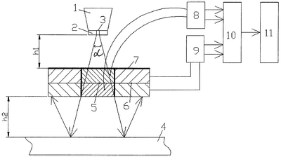 Расстояние h1 между торцевой поверхностью излучателя 1 совместно с коллиматором 2 и верхней торцевой поверхностью первой и второй камер 5 и 6 выбрано так, чтобы образующая прямого потока в значении телесного угла проходила через точки контакта наружной образующей первой камеры 5 и внутренней образующей второй камеры 6 в их нижней торцевой плоскости, обращенной к контролируемой ленте 4. Расстояние h2 между нижней торцевой поверхностью камер 5 и 6 и поверхностью контролируемой ленты 4 выбрано так, чтобы образующая отраженного потока рентгеновского излучения от структуры материала ленты 4 по крайней мере не выходила за контур наружной образующей поверхности камеры 6. В данном случае толщиной ленты 4 можно пренебречь из-за низкого влияния изменения толщины контролируемой ленты на угловое распределение интенсивности отраженного потока.