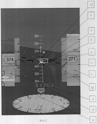 Для обеспечения полета по приборам при заходе на посадку на высоте менее 30 м для точного измерения и выдачи потребителям всех необходимых параметров движения самолета и его положения в пространстве относительно земли и ВПП (см. фиг.2), где на экране показаны силуэт самолета 2, зона полного приземления 13, шкала скорости 6, указатель радиовысоты и радиовертикальной скорости РВ 15, формируют прицельную метку посадки 12 и проецируют на экран в виде буквы “Т”, лежащей в начале зоны точного приземления на ВПП, которая при пересечении самолетом торца ВПП 3 начинает движение по оси ВПП 3 со скоростью, меньшей скорости самолета. При этом дополнительно на экране на изображении ЛА появляются стрелки радиовертикальной скорости 17, столбик радиовысоты 18, заканчивающийся символом “тень самолета” 16, уменьшается по мере убывания радиовысоты ЛА, а символ “тень самолета” 16 увеличивается в размерах при уменьшении радиовысоты. Летчик, выдерживая точку вектора скорости на прицельной метке посадки, гарантировано приводит самолет в место точного приземления, как он это делает при визуальном пилотировании. На всем этапе захода на посадку и на посадке летчику выдается более наглядно та информация, которая нужна ему на каждом этапе полета.