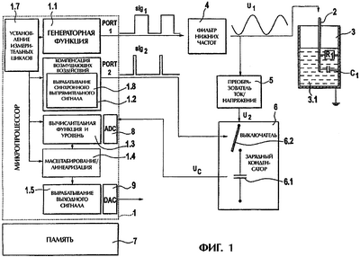 Как видно из фиг.1, микропроцессор 1 для осуществления первого метода измерений содержит функциональные блоки: генераторная функция 1.1, компенсация 1.2 возмущающих воздействий, вычислительная функция 1.3, масштабирование/линеаризация 1.4, вырабатывание выходного сигнала 1.5. Дополнительно имеется функциональный блок «установление измерительных циклов» 1.7, который определяет продолжительность измерительных циклов и продолжительность пауз между измерительными циклами. За счет этого посредством режима экономии энергии можно снизить расход тока. Дополнительно за счет изменения продолжительности пауз можно достичь повышенной невосприимчивости к электромагнитным воздействиям, поскольку между измерительным и паразитным сигналами не могут возникнуть постоянные интерференции. Посредством генераторной функции 1.1 микропроцессор 1 вырабатывает сигнал sig1 напряжения с измеряемой частотой f, который передается через PORT 1 и за счет последующего отфильтровывания нижних частот фильтром 4 преобразуется в синусоидальное напряжение U1. Генераторная функция 1.1 реализована при этом в виде делителя частоты или посредством встроенного в микропроцессор таймера, так что сигнал напряжения вырабатывается из тактового сигнала микропроцессора.