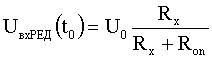Работает предлагаемое устройство следующим образом (см. временные диаграммы фиг.3). Напряжение в виде прямоугольных импульсов с выхода ОИ 1 поступает на один вывод опорного резистора 2 и одновременно на вход формирователя импульса запоминания ФИЗ 3. С второго вывода опорного резистора 2 напряжение поступает на вход РЕД 4, при чем вывод емкости связи и второй вход РЕД заземлены, а также на вход устройства выборки хранения УВХ 5. Импульс с выхода ФИЗ 3 поступает на управляющий вход УВХ 5. В момент появления напряжения на выходе ОИ 1 (t0) начинается процесс зарядки емкости связи РЕД по цепи Ron, Rx, R0-Rx, и формируется импульс запоминания. Напряжение на входе РЕД в этот момент описывается выражением . УВХ 5 в момент действия импульса запоминания (t0) фиксирует значение напряжения на входе РЕД 4, пропорциональное сопротивлениям одного плеча РЕД и опорному сопротивлению.