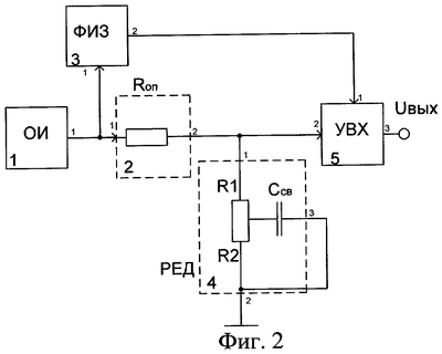 На фиг.2 изображена функциональная схема измерительного преобразователя. Позиции на фиг.2 обозначают: 1 – опорный источник (ОИ), 2 – опорный резистор R0, 3 – формирователь импульса запоминания (ФИЗ), 4 – резистивно-емкостной датчик с заземленной емкостью связи, 5 – устройство выборки хранения (УВХ).