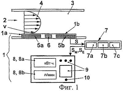 На фиг.1 показан газовый счетчик, содержащий счетчик тепловой энергии или массовый расходомер 1а, 1b, 7, который включает датчик 1а, расположенный в канале протекания потока или трубе 2, мембрану 1b и блок 7 измерения и оценки. Газ 3 с профилем 4 распределения скоростей протекает по трубе 2. На датчик 1а действует поток со скоростью v, которую измеряют. Газовый счетчик 1 содержит нагревательный элемент 6, первый температурный датчик 5а, расположенный до него относительно направления потока, и второй температурный датчик 5b, расположенный после него относительно направления потока. На основе температурных сигналов T1, T2 от температурных датчиков 5а, 5b можно известным образом определить сигнал SM, соответствующий расходу в единицах массы или объема в стандартных условиях. Базовый режим работы основан на том факте, что распределение температуры в потоке 4, которое создается нагревательным элементом 6, становится асимметричным, и разность T1-Т2 температур около температурных датчиков 5а, 5b используется в качестве меры скорости v потока или массового расхода dm/dT. С хорошим приближением сигнал SM массового расхода пропорционален разности T1-T2 температур. В настоящем случае, помимо этого, измерительное устройство 7 на основе сигнала SM массового расхода или, в общем случае, сигнала S датчика 1а расхода определяет сигналы SE значения энергии и выводит их на основе калибровки газового счетчика 1 в качестве счетчика энергии. Калибровка в качестве счетчика энергии раскрыта в документе WO 01/96819 А1, содержание которого включено в настоящее описание путем ссылки. Аналогично, три статьи авторов J.Robadey и F.Mayer и др., относящиеся к КМОП-анемометру, на которые в этом документе даны ссылки, включены в настоящее описание путем ссылки. Описанный там КМОП-анемометр особенно хорошо подходит для использования в качестве датчика 1а.