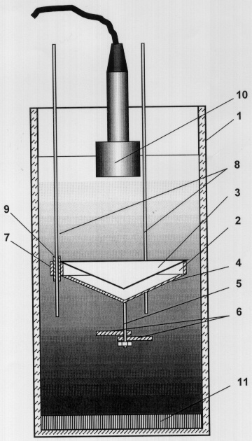Изобретение поясняется чертежом, на котором схематично изображена конструкция измерителя. В измерительном баке 1 с прозрачными стенками (например, из оргстекла), наполненном дистиллированной водой, находится мишень 2, представляющая собой герметично закрытую тонкой (около 0,1 мм) вогнутой конусной мембраной 3 конусную чашу 4, к днищу которой припаян стержень 5 с котировочными грузами 6, выполненными в виде пластин с несимметричным расположением отверстия для крепления на стержне 5 для регулировки плавучести и пространственного положения мишени. К ободу мишени на равном расстоянии друг от друга припаяны держатели 7, в которые с помощью резьбового соединения вставлены сменные проволочные компенсаторы 8 таким образом, что их верхние концы находятся над поверхностью воды, а вертикальное положение компенсаторов 8 относительно мишени регулируется их вращением относительно собственной оси.