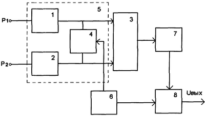 Способ осуществляют следующим образом. В измеряемый поток газа или воздуха помещают входной конец пневмометрической трубки (точки отбора давления измеряемой среды P1 и Р2), каналы которой являются постоянными пневмосопротивлениями 1 и 2. На выходном конце трубки возникает постоянный сигнал перепада давления. Между выходными каналами пневмометрической трубки и входными каналами дифференциального датчика давления 3 устанавливают переменное пневмосопротивление 4, которое вместе с пневмосопротивлениями 1 и 2 образует делитель пневмосигнала 5. Переменное пневмосопротивление может быть выполнено в виде пар «сопло-заслонка», «шарик-конус», «шарик-цилиндр» и др., их проходное сечение (величина пневмосопротивления) изменяют управляющим сигналом синхронизатора 6 по закону периодической функции времени. Диапазон изменения величины переменного пневмосопротивления 4 подбирают экспериментально таким образом, чтобы при минимальной его величине постоянные пневмосопротивления 1 и 2 намного превышали ее, а при максимальной величине пневмосопротивления 4 – были намного меньше. Это приводит к получению максимальной амплитуды переменного пневмосигнала на входе датчика 3, что обеспечивает компенсацию температурной дрейфовой составляющей погрешности измерений наилучшим образом. Выходной электрический переменный сигнал дифференциального датчика 3 усиливают и преобразуют в блоке 7. Затем этот сигнал подают на вход синхронного детектора 8, работой которого также управляет синхронизатор 6. По выходному сигналу детектора 8 Uвых. судят о величине перепада давления P1-P2.