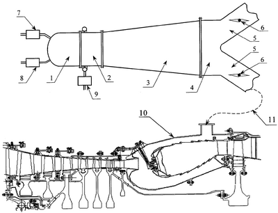 Один из каналов 5, за распределенной секцией 4 потока парогазовой смеси, посредством трубопроводов 11 соединяют с камерой сгорания двигателя 10, на котором требуется определить характеристики компрессора. Другой канал 5 соединяют с выхлопной шахтой стенда (на чертеже не показаны). Дроссель 6 в канале 5, соединяющем заявляемое устройство с двигателем 10, устанавливают в закрытое положение. Второй дроссель 6 – открыт. Осуществляют подачу топлива и окислителя в камеру 1 сгорания топлива и производят ее запуск (зажигание). После запуска (зажигания) подают воду в секцию 2. Изменяя величины расходов в регулируемых: канале 7 подвода топлива в камеру 1 сгорания топлива, канале 8 подвода окислителя в камеру 1 сгорания топлива, канале 9 подвода воды в секцию 2 ввода воды, вводимой в газовый поток за камерой 1 сгорания топлива, и положение дросселя 6 в канале 5, соединенном с выхлопной шахтой стенда, устанавливают необходимые для ввода в камеру сгорания двигателя 10 параметры парогазовой смеси: