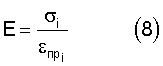 Продолжают прикладывать силы n*F, где n=2, …m, находят продольные, поперечные деформации и осевые напряжения. Строят зависимость продольной деформации от осевого напряжения. Для линейного участка кривой деформирования определяют модуль упругости Е (8) и коэффициент Пуассона (9) композиционного материала