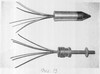 Фотография вариантов исполнения проводников 1 и изоляторов 2 устройства контактной связи до скрепления с метаемым телом 8 представлена на фиг.12. Фотография примененных в ряде испытаний вариантов метаемых тел (ударников) 8 в сборе с изолятором 2 и проводниками 1 приведена на фиг.13.