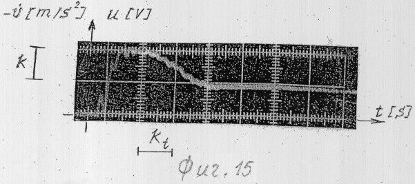Осциллограммы на фиг.15 и фиг.16 регистрировались одновременно по двум каналам с различной калибровкой по времени. Осциллограмма на фиг.15 с калибровкой по времени kt=50 мкс/кл более подробно отражает историю замедления ударника 8 в начальном периоде процесса его действия по преграде 10. Эскиз осциллограммы на фиг.16 с калибровкой по времени kt=100 мкс/кл проведен по средней линии следа луча на осциллограмме и представляет историю замедления ударника 8 в периоде всего времени процесса пробития разнесенной преграды 10. Под осциллограммой отмечен момент времени окончания процесса пробития ударником 8 преграды 10. Масштаб осциллограммы по ускорению .