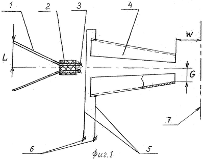 Устройство контактной связи предназначено для соединения бортового оборудования метаемого тела с наземной аппаратурой и, как показано на фиг.1, включает, по меньшей мере, один проводник 1, скрепленный с изолятором 2 и снабженный элементами электрического подключения 3 к бортовой аппаратуре метаемого тела и, по меньшей мере, один, выполненный из электропроводящего материала, токосъемник 4, электрически соединенный с проводом 5 канала линии электрической связи, снабженным элементами подключения 6 к наземной аппаратуре. Расстояние L от наиболее удаленного края проводника 1 до продольной оси изолятора 2 и минимальный размер G токосъемника 4 в направлении, ортогональном его продольной оси, заведомо превышают половину значения максимального диаметрального размера метаемого тела. Продольная ось как изолятора, так и токосъемника в простейшем случае являются осью их симметрии, совпадающей с осью симметрии метаемого тела. На фиг.1 представлен вариант исполнения устройства для двухпроводного канала линии электрической связи, в котором токосъемники 4 в виде двух удлиненных элементов размещены симметрично относительно заданной траектории движения метаемого тела и закреплены так, чтобы обращенный к преграде торец токосъемника 4 размещался на расстоянии W от лицевой поверхности преграды, положение которой обозначено пунктирной линией 7 с двумя штрихами. Увеличение значения L создает условия для удара концов проводников 1 о задний торец токосъемника 4 и ухудшения функционирования проводников 1 с токосъемником 4 в режиме контакта. Уменьшение значения G приведет к удару метаемого тела по обращенному к преграде торцу токосъемника 4 и нарушению функционирования устройства или искажению регистрируемых данных о процессе. Значение W определяет совпадение моментов начала режима контакта проводников 1 с токосъемником 4 и начала действия метаемого тела по преграде, что приводит к максимальному возможному периоду времени непрерывной электрической регистрации параметров конечной баллистики. Значения G и W связаны соответственно с калибром (миделем диаметром d) метаемого тела и его длиной. В изоляторе 2 закреплены два проводника 1, выполненных из деформируемого упруго материала, первоначальная форма которых задана конструктивно. Наклон контактной поверхности токосъемника 4 по отношению к заданной траектории движения метаемого тела, длина токосъемника 4 и длина и угол отклонения проводников 1 от продольной оси изолятора 2 выбираются из условий обеспечения требуемого периода поддержания режима контакта проводника 1 с токосъемником 4 и который в свою очередь определяется временем протекания исследуемого процесса конечной баллистики. Число элементов токосъемника 4 и соответствующих каждому элементу проводников 1 определяется требуемым в испытаниях числом каналов линии электрической связи. Материал и конструктивные размеры элементов контактирующей пары «проводник-токосъемник» выбираются из условий обеспечения непрерывности режима контакта в требуемый промежуток времени, при этом не имеет значения степень разрушения или эрозии элементов, а важно обеспечить лишь то, чтобы при контактировании не создавались условия для возникновения паразитных электрических зарядов, искажающих величину и характер изменения полезного сигнала от б