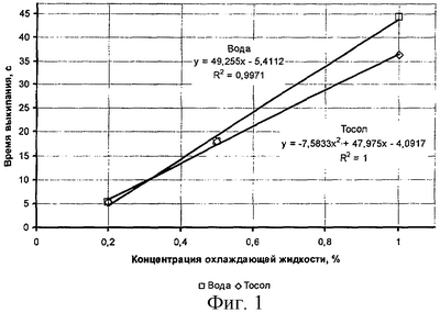 На фиг.1 приведены графики зависимости времени выкипания воды и тосола из испытуемого масла от концентрации ОЖ в них для первого диапазона концентраций ОЖ, а на фиг.2 – для второго диапазона соответственно. Точки опытных данных, полученные на основании опытных данных для эталонных смесей, приведены на чертежах.