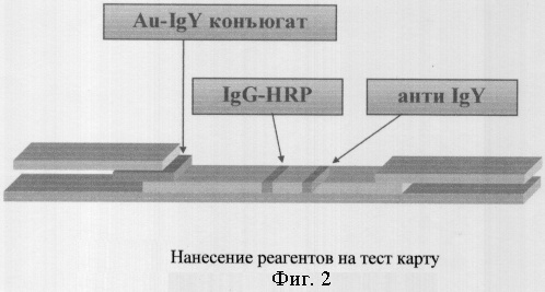 Меченные красителем антитела IgY (Aves Labs, США) получали конъюгированием с коллоидным золотом. Поверхность стандартных частиц золота содержит отрицательно-заряженные ионы, которые свободно взаимодействуют с образованием ионной связи с позитивно-заряженными аминокислотными остатками пептида.