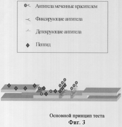 Принцип анализа основан на качественном твердофазном конкурентном иммуноферментном связывании антигена, содержащего разные иммунногенные епитопы, с двумя типами: фиксирующими и детектирующими антителами (фиг.3).