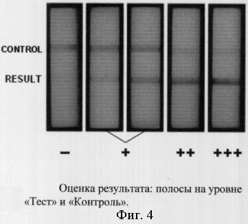 Результат (фиг.4) считается положительным при проявлении ярко-красной МДОР полосы в положении «Результат» (+++), красной МДОР полосы (-н-) и розовой МДОР полосы (+) или количественном варианте в соответствии с интенсивностью окраски на референс-карте (фиг.5). При проявлении только контрольной полосы результат считается отрицательным (-). При окончании срока годности полосы отсутствуют.