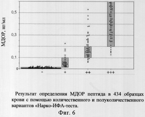 На фиг.6 представлены результаты тестирования 434 образцов крови, из которых 218 пациентов употребляли опийные наркотики. Концентрация МДОР пептида, определенная с помощью полу- и количественного «Нарко-ИФА-теста», варьировалась в широком диапазоне от <0,05 до 0,60 нг/мл. Значения МДОР пептида распределялись следующим образом: 227 образцов показали концентрацию МДОР 0,05 нг/мл и 207 образцов в пределах от 0,1 до 0,60 нг/мл. Определение основных характеристик тестов показали чувствительность выявления заболевания 93% и специфичность выявления здоровых лиц 98%. Фальш-положительный ответ определен в 4 случаях и фальш-отрицательный ответ – в 15 случаях.