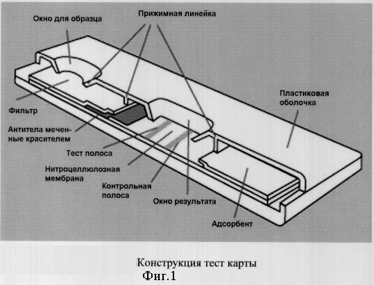 Тест-карта является основным компонентом набора «Нарко-ИФА-пептидный тест» (полуколичественный вариант), предназначенного для анализа свежеотобранной крови пациента (фиг.1). В состав тест-карты включаются фильтр, содержащий ЕДТА для отделения плазмы, нироцеллюлозная мембрана с нанесенными полосами: (1) меченных красителем IgY, (2) IgG-HRP (тест полоса) и (3) козьих антител против IgY (контрольная полоса, фиг.1, 2). Адсорбент представляет собой фильтр, содержащий блокирующий реагент. Тест карта помещается в пластиковый корпус с окном результата, в котором должны быть видны контрольная и тестовая полосы (фиг.2).