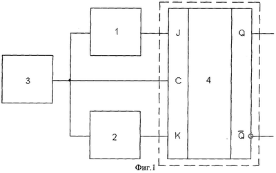 На фиг.1 приведена схема устройства, реализующего способ. Оно содержит параметрические формирователи переходных процессов 1 и 2, генератор импульсов 3 и собственно JK-триггер 4. Электрические параметры параметрических формирователей переходных процессов 1 и 2, например времени прохождения сигналов через них, зависят от значений параметров их радиокомпонентов. Сигналы сравнения снимаются с выходов триггера 4.