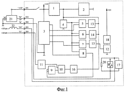 К пяти выводам устройства подключены: напряжение бортовой сети автомобиля +12 В (XS1), вывод “Ш” или “20” регулятора напряжения 21 (XS2), общий вывод “М” или “30” (XS3), вывод обмотки возбуждения 22 генератора OB (XS4), вывод “СТ” выключателя зажигания (XS5).