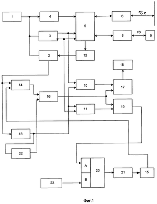 Акустический измеритель расстояний содержит синхронизатор 1 соединенный с формирователем импульса строба 2, счетным триггером 3 и генератором зондирующих сигналов 4, выход которого через мультиплексор 5 соединен с акустической системой 6, находящейся в акустическом контакте со средой лоцирования 7, а также со второй акустической системой 8, находящейся в акустическом контакте со средой лоцирования 7 и на известном состоянии r0 от которой расположен отражатель 9; прямой и инверсный выходы счетного триггера 3 соединены с выходами второй 10 и третьей 11 схем “И”, а также с управляющими входами мультиплексора 5, выход которого через приемный тракт 12 соединен со вторым входом формирователя строба 2, выход которого соединен с входом первого ждущего мультивибратора 13 и схемой “И” 14, второй вход которой соединен с выходом генератора тактовых импульсов 15, а выход – со счетным 19 выходом счетчиком 16, выходы которого через регистр 17 соединены с цифровым индикатором 18, а также через второй регистр 19 с входами “А” блока сравнения цифровых кодов А и В 20, выходы которого через блок управления 21 соединены с управляющим входом тактового генератора 15; выход первого ждущего мультивибратора 13 соединен с входом второго ждущего мультивибратора 22, а также со вторыми входами второй 10 и третьей 11 схем “И”, выходы которых соединены соответственно со входами разрешения записи регистра 17 и второго регистра 19; выход второго ждущего мультивибратора 22 соединен с входом сброса счетчика 16, а блок установки кода 23 подключен ко входам “В” блока сравнения цифровых кодов 20. Синхронизатор 1 вырабатывает периодически повторяющиеся синхроимпульса U1, переключающие счетный триггер 3 и запускающие формирователь строба 2 и генератор зондирующих сигналов 4, с выхода которого радиоимпульс поступает через мультиплексор на акустическую систему 6 или на вторую акустическую систему 8, находящиеся в акустическом контакте со средой лоцирования 7 и излучающие в нее акустический импульсный сигнал, распространяющийся в среде и отражающийся от отражателя 9, расположенного на известном расстоянии r0 от акустической системы 8 или от границы среды лоцирования (или объекта находящегося в среде), удаленных от акустической системы на неизвестное расстояние rх. Переключение мультиплексора 5 осуществляется сигналами U2 и U3, снимаемыми с выходов счетного триггера.